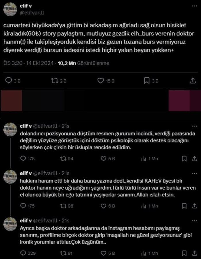 Üniversite öğrencisi olduğunu iddia eden kullanıcı, "Cumartesi Büyükada'ya gittim bir arkadaşım ağırladı sağ olsun, bisiklet kiraladık (60 TL). Story paylaştım, mutluyuz gezdik elh... Burs verenim doktor hanım(!) ile takipleşiyorduk. Kendisi 'Biz gezene tozana burs vermiyoruz' diyerek verdiği bursun iadesini istedi" yazdı.