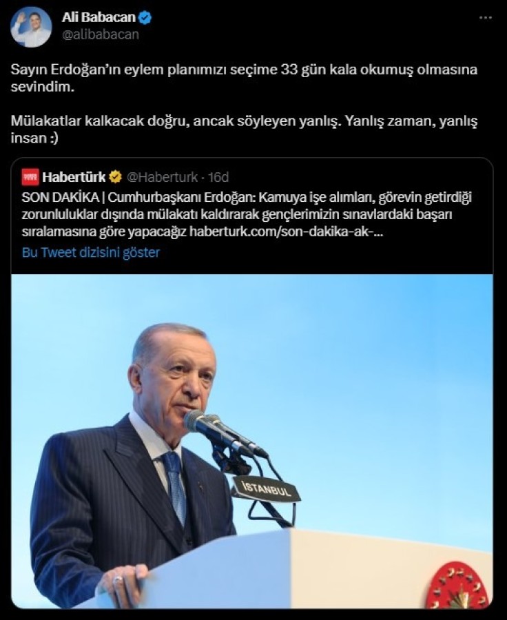 HaberTürk'ün Erdoğan'ın seçim beyanname haberini Twitter'dan alıntılayan Babacan, "Sayın Erdoğan'ın eylem planımızı seçime 33 gün kala okumuş olmasına sevindim. Mülakatlar kalkacak doğru, ancak söyleyen yanlış. Yanlış zaman, yanlış insan" ifadelerini kullandı.