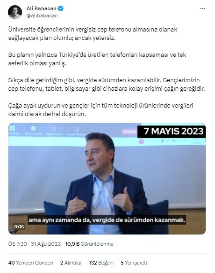 Babacan da sosyal medya platformu X üzerinden konuya dair açıklamalarda bulundu. Teknolo"Gençler için tüm teknoloji ürünlerinde vergileri daimi olarak derhal düşürün"jik cihazlara erişimin çağın gereği olduğunu vurgulayarak yaptığı videolu paylaşımda Babacan, "Üniversite öğrencilerinin vergisiz cep telefonu almasına olanak sağlayacak plan olumlu; ancak yetersiz. Bu planın yalnızca Türkiye'de üretilen telefonları kapsaması ve tek seferlik olması yanlış. Sıkça dile getirdiğim gibi, vergide sürümden kazanılabilir. Gençlerimizin cep telefonu, tablet, bilgisayar gibi cihazlara kolay erişimi çağın gereğidir. Çağa ayak uydurun ve gençler için tüm teknoloji ürünlerinde vergileri daimi olarak derhal düşürün" ifadelerini kullandı.