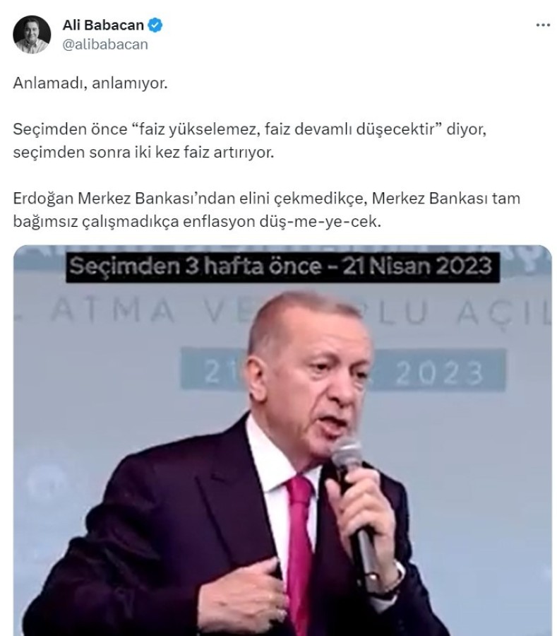 Babacan, faiz kararına ilişkin sosyal medya hesabından yaptığı paylaşımda, seçimden önce Cumhurbaşkanı ve AK Parti Genel Başkanı Recep Tayyip Erdoğan'ın, "Bu kardeşiniz iktidarda olduğu sürece faiz yükselemez. Faiz devamlı düşecektir" dediği videoya yer verdi. Babacan, paylaşımına şu notu ekledi: