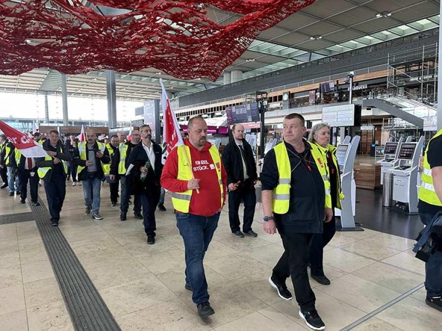 Berlin-Brandenburg Havalimanı'nın önündeki Willy-Brandt Meydanı'nda toplanan bir grup çalışan gösteri yaptı.