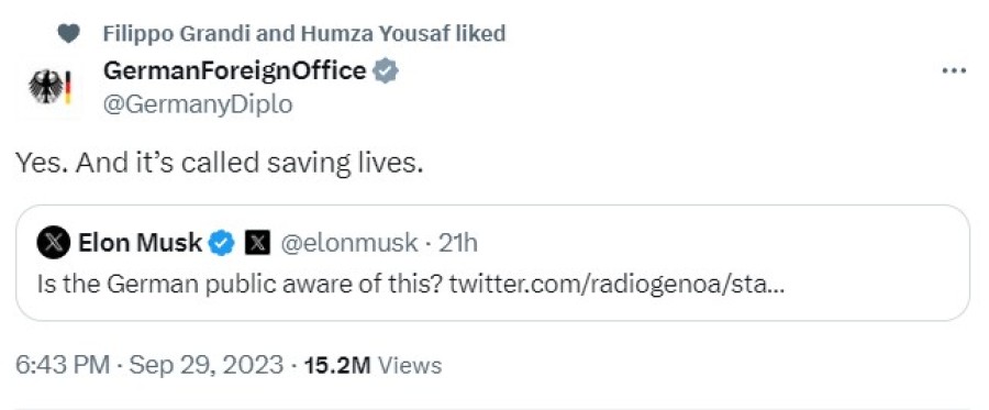 ABD başta olmak üzere mülteci akınına karşı açıklamalar yapan Elon Musk, 'Alman hükümeti tarafından desteklenen Alman sivil toplum kuruluşlarına ait, Akdeniz'de görev yapan ve mültecileri kurtaran 8 Alman gemisi haberine' "Alman halkı bundan haberdar mı?" mesajını paylaştı. Almanya Dışişleri Bakanlığı'na ait 'hükümet kurumu' onaylı hesaptan Musk'a "Evet. Ve buna hayat kurtarma deniliyor" cevabı geldi. Paylaşımın, ayrıca Birleşmiş Milletler Yüksek Komiseri Filippo Grandi ve İskoçya Birinci Bakanı Humza Yousaf tarafından beğenildiği görüldü.