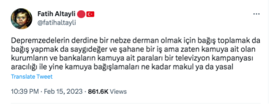 HaberTürk yazarı Fatih Altaylı, 'Türkiye Tek Yürek' kampanyasında kamu kurumlarının yaptığı bağışlar hakkında "Zaten kamuya ait olan kurumların ve bankaların kamuya ait paraları kamuya bağışlamaları ne kadar makul ya da yasal" diye sordu.