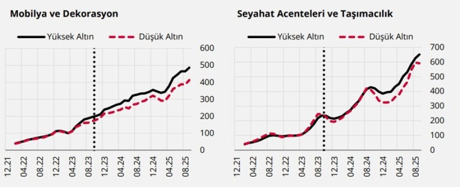 Altındaki değer artışının etkisinin kredi ve banka kartı harcamaları üzerinde nasıl bir değişime yol açtığı, alt harcama grupları ayrımında incelenirken, altın fiyatlarındaki artışın özellikle dayanıklı ve yarı dayanıklı ürün ve seyahat harcamalarında anlamlı bir etki yaptığı belirtildi.