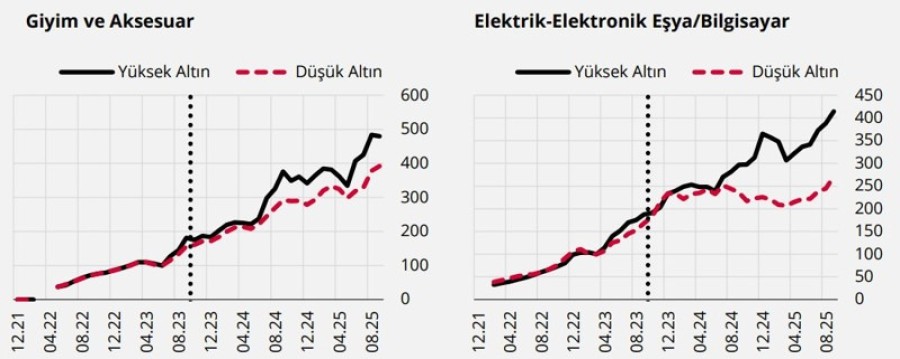 "Yüksek ve Düşük Altın Oranına Sahip İllerin Seçili Kartlı Harcama Kalemlerinin Gelişimi" başlıklı verilere göre, yüksek altın ve düşük altın oranı olan illerde en yüksek farklılık, elektrik-elektronik eşya/bilgisayar harcamalarında oldu. Giyim ve aksesuardaysa farklar daha az olmasına karşın dikkat çekti.