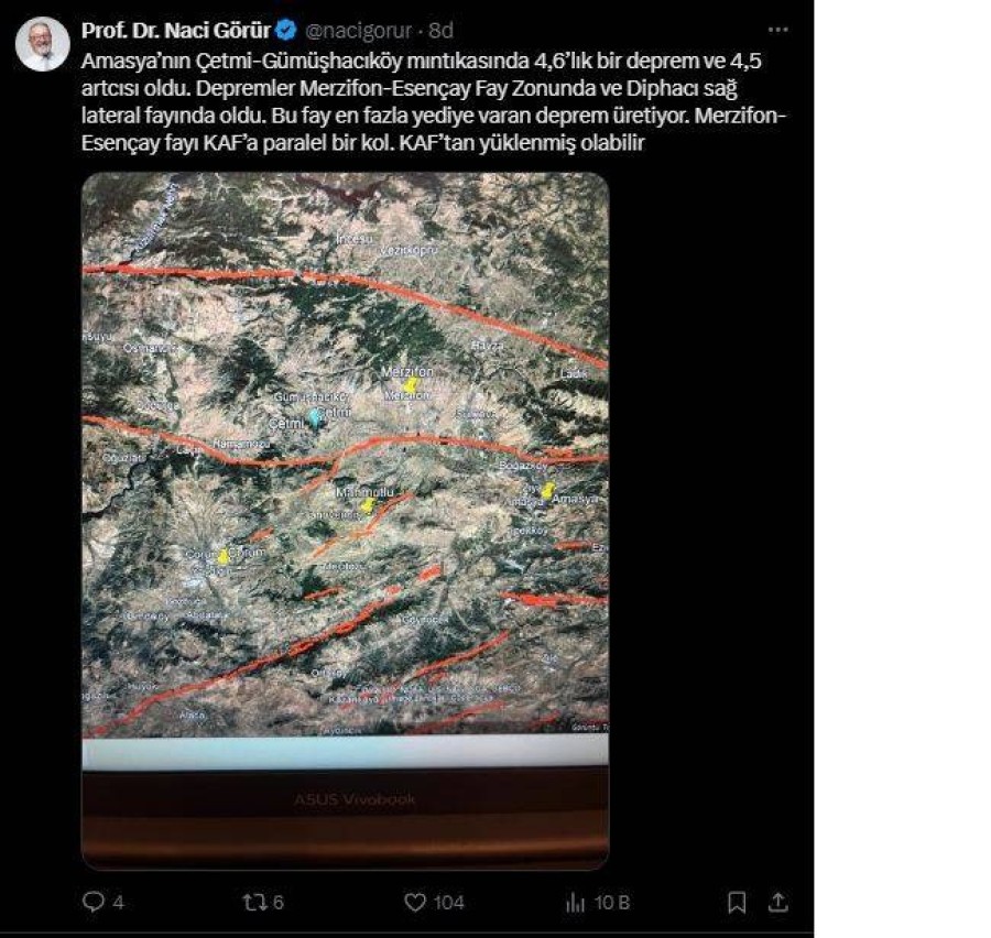 "Amasya'nın Çetmi-Gümüşhacıköy mıntıkasında 4,6'lık bir deprem ve 4,5 artcısı oldu. Depremler Merzifon-Esençay Fay Zonunda ve Diphacı sağ lateral fayında oldu. Bu fay en fazla yediye varan deprem üretiyor. Merzifon-Esençay fayı KAF'a paralel bir kol. KAF'tan yüklenmiş olabilir."