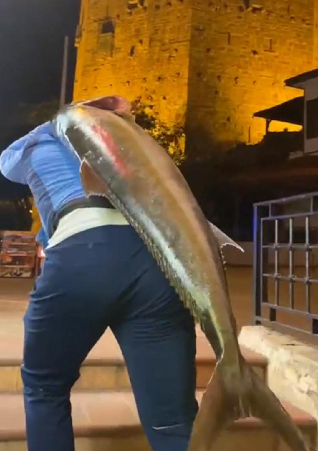 Antalya'da amatör balıkçı Rüştü Mert Kesmen, olta ile 1,6 metre uzunluğunda, 41 kilo ağırlığında akya (kuzu) balığı yakaladı. Kesmen'in balığı karaya çıkartıp, sırtında taşıdığı anları ise arkadaşının cep telefonu kamerasına yansıdı. Kesmen ise "Balığı sırtlayarak götürdüm çünkü poşete sığmadı. O kadar büyük poşet bulamadık." diye konuştu.