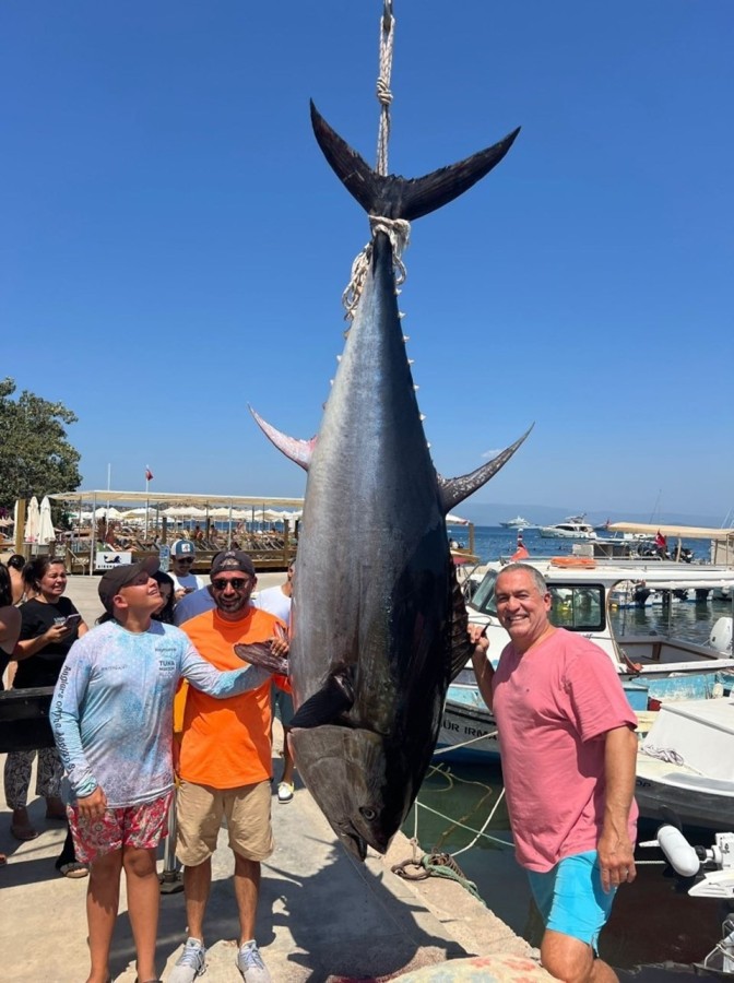 Muğla'nın Bodrum ilçesinde 4 amatör balıkçı, dev bir orkinos yakaladı. Yaklaşık 3,5 metre uzunluğunda ve tam 376 kilogram ağırlığındaki orkinos, balıkçılar ve vatandaşlar arasında büyük heyecan yarattı.