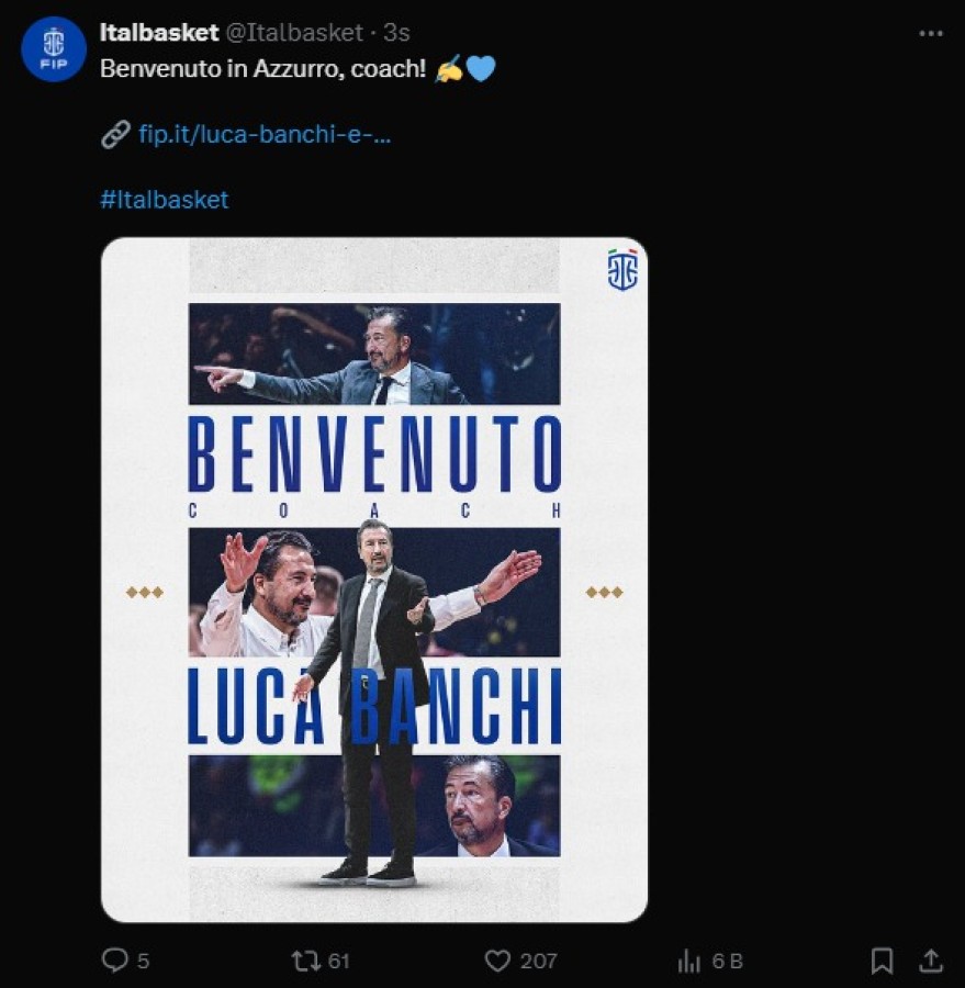 İtalya Milli Basketbol Takımı'nın başantrenörlük görevine Luca Banchi getirildi.