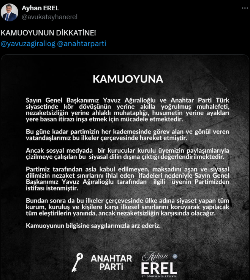 "Sayın Genel Başkanımız Yavuz Ağıralioğlu ve Anahtar Parti Türk siyasetinde kör dövüşünün yerine akılla yoğrulmuş muhalefeti, nezaketsizliğin yerine ahlaklı muhataplığı, husumetin yerine ayakları yere basan itirazı inşa etmek için mücadele etmektedir. Bu güne kadar partimizin her kademesinde görev alan ve gönül veren vatandaşlarımız bu ilkeler çerçevesinde hareket etmiştir. Ancak sosyal medyada bir kurucular kurulu üyemizin paylaşımlarıyla çizilmeye çalışılan bu siyasal dilin dışına çıktığı değerlendirilmektedir. Partimiz tarafından asla kabul edilmeyen, maksadını aşan ve siyasal dilimizin nezaket sınırlarını ihlal eden ifadeleri nedeniyle Sayın Genel Başkanımız Yavuz Ağıralioğlu tarafından ilgili üyenin Partimizden istifası istenmiştir. Bundan sonra da bu ilkeler çerçevesinde ülke adına siyaset yapan tüm kurum, kuruluş ve kişilere karşı ilkesel sınırlarını koruyarak yapılacak tüm eleştirilerin yanında, ancak nezaketsizliğin karşısında olacağız."