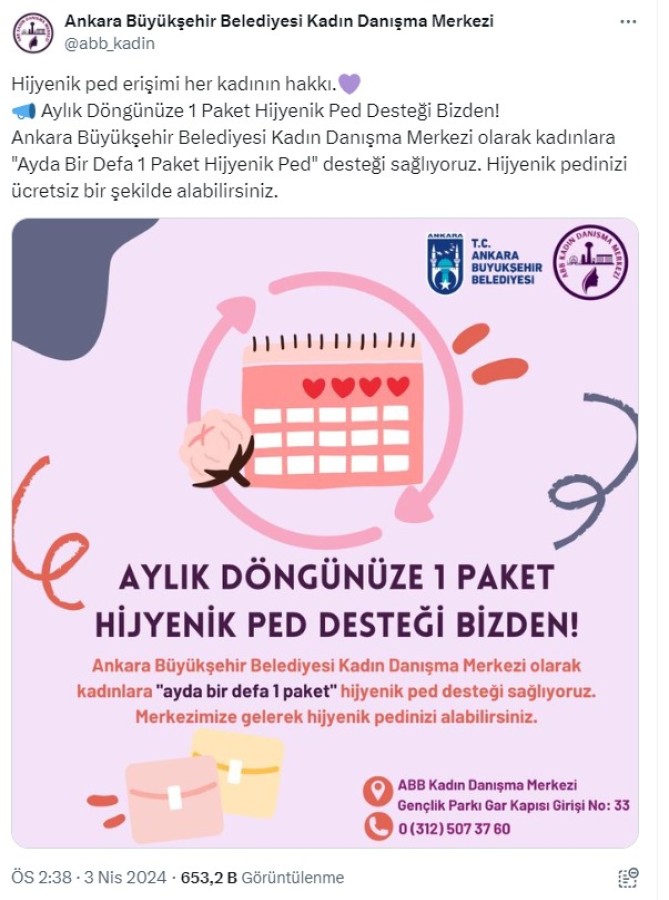 "Hijyenik ped erişimi her kadının hakkı. Aylık Döngünüze 1 Paket Hijyenik Ped Desteği Bizden! Ankara Büyükşehir Belediyesi Kadın Danışma Merkezi olarak kadınlara 'Ayda Bir Defa 1 Paket Hijyenik Ped' desteği sağlıyoruz. Hijyenik pedinizi ücretsiz bir şekilde alabilirsiniz."