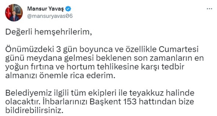 Ankara Büyükşehir Belediye Başkanı Mansur Yavaş, Twitter hesabından yaptığı açıklamada, fırtına ve hortuma karşı tedbirli olunmasını isteyerek, "Değerli hemşerilerim; önümüzdeki 3 gün boyunca ve özellikle cumartesi günü meydana gelmesi beklenen son zamanların en yoğun fırtına ve hortum tehlikesine karşı tedbir almanızı önemle rica ederim. Belediyemiz ilgili tüm ekipleri ile teyakkuz halinde olacaktır. İhbarlarınızı Başkent 153 hattından bize bildirebilirsiniz" dedi.