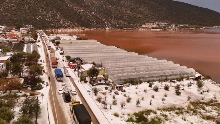 Antalya'nın Demre ilçesinde etkili olan dolu seralara zarar verdi, şiddetli yağış sele neden oldu. Dolu ve sel nedeniyle yollar ulaşıma kapanırken, denize akan çamur nedeniyle Demre sahilleri kızıla boyandı.
