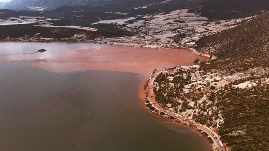 Yağış sonrası sel meydana gelirken, denize akan çamur nedeniyle Demre kıyıları kızıl renge boyandı.