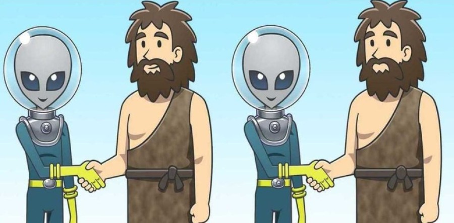 Uzaylıyı selamlayan mağara adamını gösteren bu iki fotoğraf arasında 3 fark var. Bulmak için ise 12 saniyeniz var.