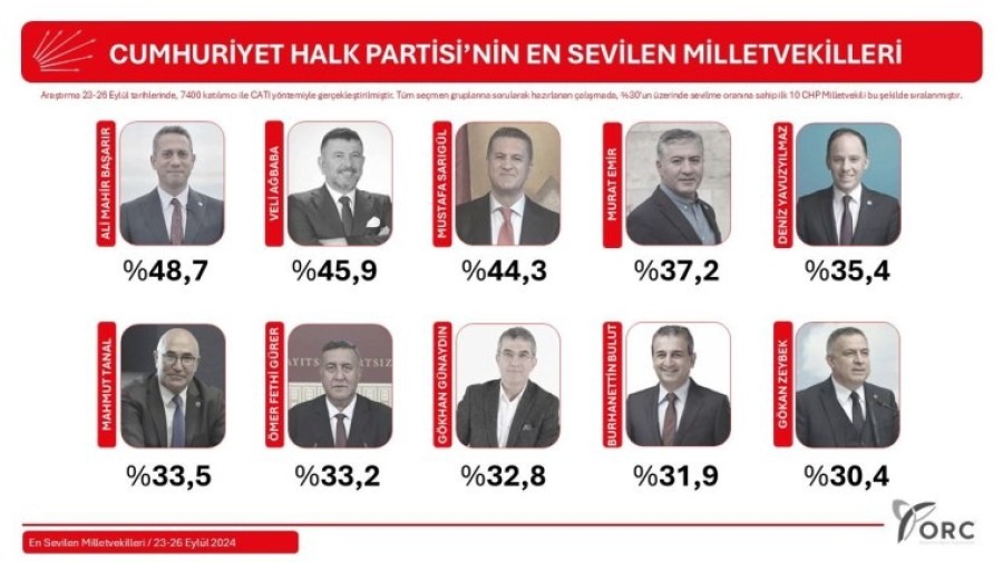 ORC Araştırma, 'CHP'nin en sevilen milletvekilleri' anketinin sonuçlarını paylaştı. Listede Mersin Milletvekili Ali Mahir Başarır yüzde 48,7 ile birinci sırada olurken Başarı'ı Veli Ağbaba ve Mustafa Sarıgül takip etti.
