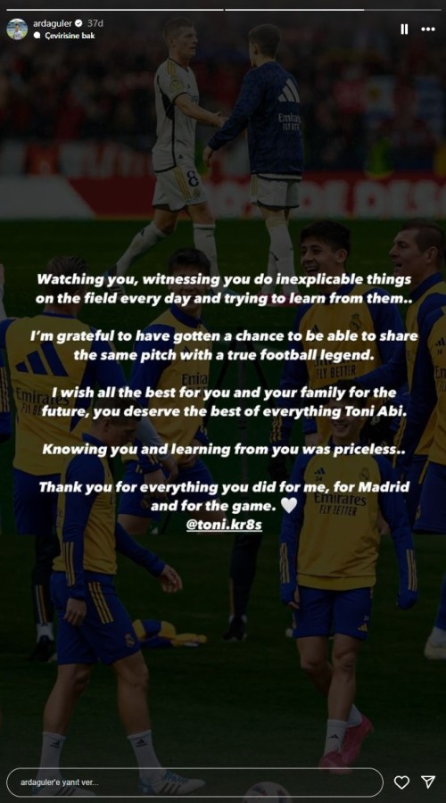 Kroos'un takım arkadaşı olan milli futbolcu Arda Güler, sosyal medya hesabından yıldız futbolcu için bir veda paylaşımında bulundu.