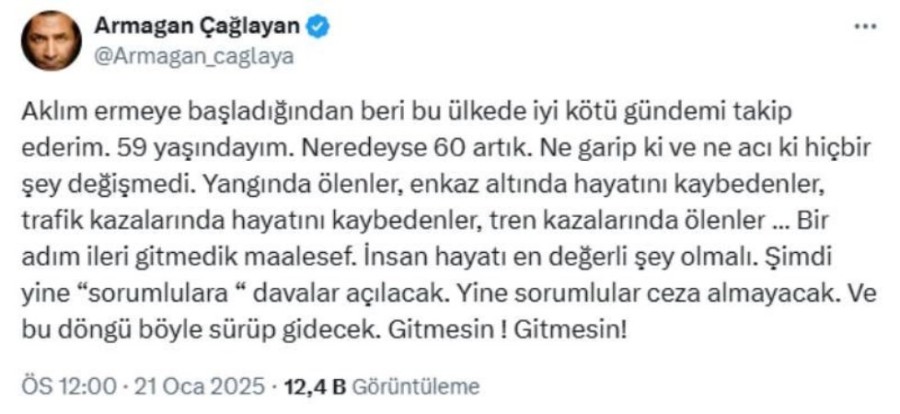 X (Twitter) hesabından paylaşım yapan ünlü sunucu, "Aklım ermeye başladığından beri bu ülkede iyi kötü gündemi takip ederim. 59 yaşındayım. Neredeyse 60 artık. Ne garip ki ve ne acı ki hiçbir şey değişmedi. Yangında ölenler, enkaz altında hayatını kaybedenler, trafik kazalarında hayatını kaybedenler, tren kazalarında ölenler... Bir adım ileri gitmedik maalesef" mesajını yazdı.