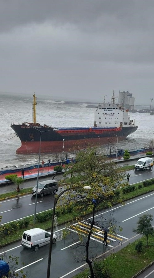 Artvin'in Hopa ilçesinde fırtına nedeniyle bir kuru yük gemisi dalgalara dayanamayarak önce kıyıya sürüklendi, ardından karaya oturdu. Karaya oturan gemide 12 personel olduğu öğrenildi.
