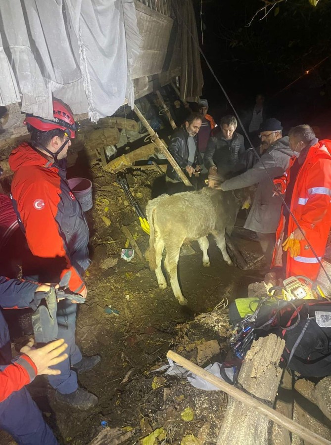 Büyükbaşlardan 1'i kurtarılırken, 1 ineğin öldüğü belirlendi.