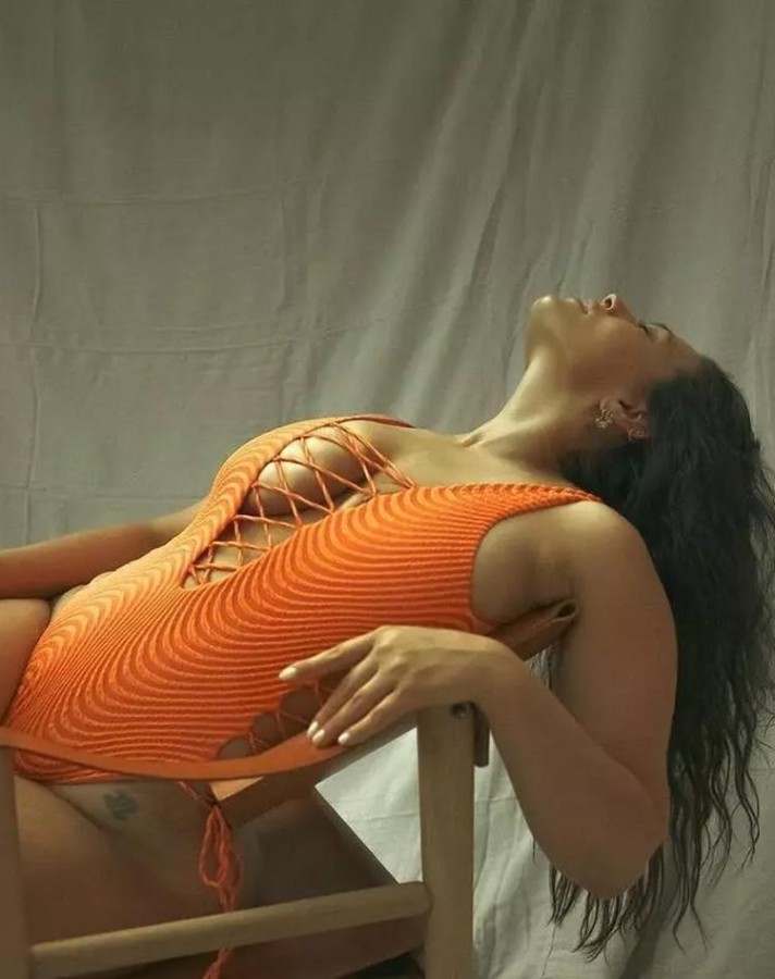 İp detaylı turuncu renkte bir mayo tercih eden büyük beden model Ashley Graham, iddialı pozlarıyla sosyal medyayı salladı.