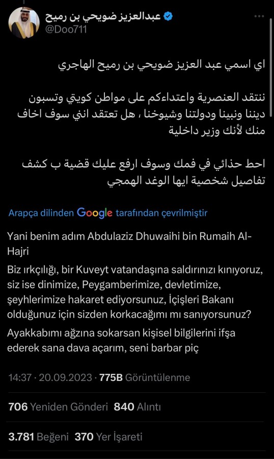 "Yani benim adım Abdulaziz Dhuwaihi bin Rumaih Al-Hajri. Biz ırkçılığı, bir Kuveyt vatandaşına saldırınızı kınıyoruz, siz ise dinimize, Peygamberimize, devletimize, şeyhlerimize hakaret ediyorsunuz, İçişleri Bakanı olduğunuz için sizden korkacağımı mı sanıyorsunuz? Ayakkabımı ağzına sokarsan kişisel bilgilerini ifşa ederek sana dava açarım, seni barbar p*ç"