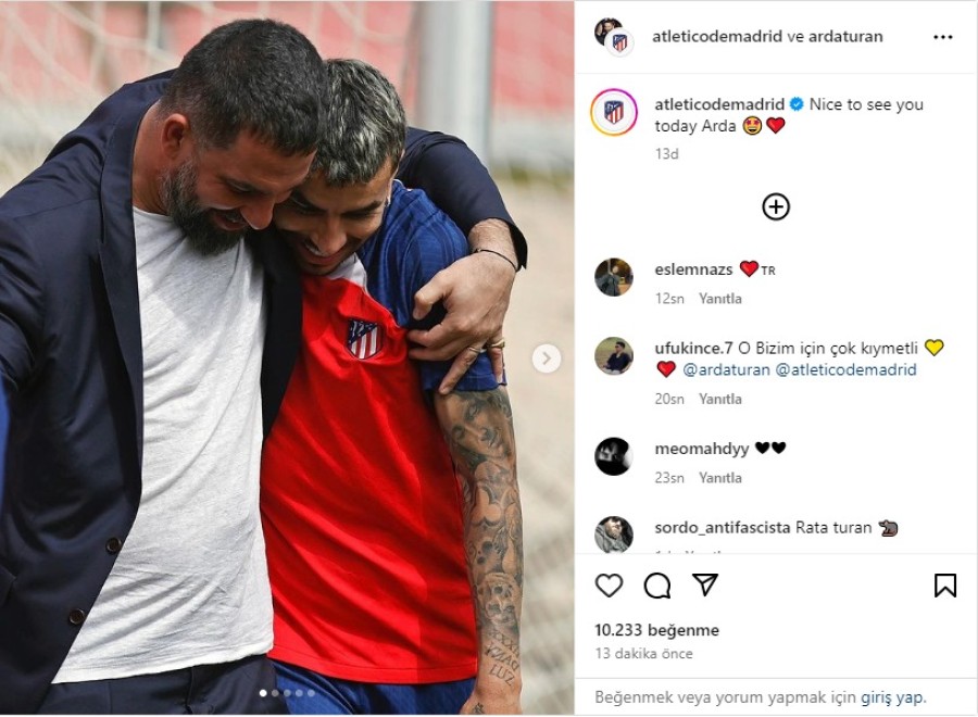 Eski milli futbolcu ve Eyüpspor Teknik Direktörü Arda Turan, efsanesi olduğu Atletico Madrid'i ziyaret etti. Kurt hoca Diego Simeone ile de özel bir görüşme gerçekleştiren Arda Turan için Atletico Madrid'den yapılan paylaşımda, ''Bugün seni gördüğüme sevindim Arda'' ifadelerine yer verildi.