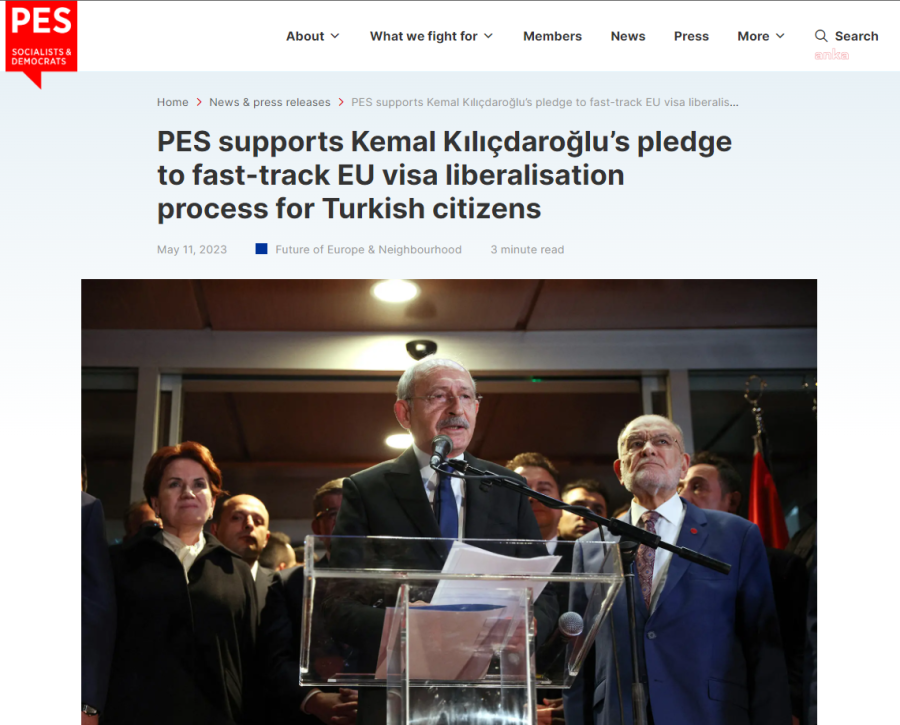 Avrupa Sosyalistler Partisi (PES), "PES muhalefetin ortak cumhurbaşkanı adayı olan Kemal Kılıçdaroğlu'nun, Türkiye'nin Avrupa Birliği (AB) ile vize serbestisi süreci için gereken reformları tamamlama vaadini desteklemektedir... PES, AKP'nin önde gelen isimlerinden, Dışişleri Bakanı Mevlüt Çavuşoğlu'nun Türk vatandaşları için vize serbestisi kriterlerinin hızlı bir şekilde yerine getirilmesinin mümkün olmadığı yönündeki yorumlarına katılmamaktadır. Bu, AB politikası ve süreçleri konusunda net bir vizyon ve bilgi eksikliğini yansıtmaktadır. Ülkeyi Avrupa değerlerinden uzaklaştıran ve katılım sürecini tamamen durduran Cumhurbaşkanı Erdoğan ve onun otoriter yöntemi olmuştur" açıklamasını yaptı.