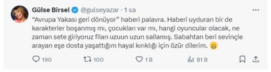 "Avrupa Yakası geri dönüyor" haberi palavra. Haberi uyduran bir de karakterler boşanmış mı, çocukları var mı, hangi oyuncular olacak, ne zaman sete giriyoruz, filan uzun uzun sallamış. Sabahtan beri sevinçle arayan eşe dosta yaşattığım hayal kırıklığı için özür dilerim."