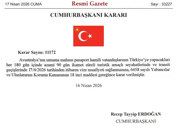 "Avustralya'nın umuma mahsus pasaport hamili vatandaşlarının Türkiye'ye yapacakları her 180 gün içinde azami 90 gün ikamet süreli turistik amaçlı seyahatlerinde ve transit geçişlerinde 17/4/2026 tarihinden itibaren vize muafiyeti sağlanmasına, 6458 sayılı Yabancılar ve Uluslararası Koruma Kanununun 18 inci maddesi gereğince karar verilmiştir."