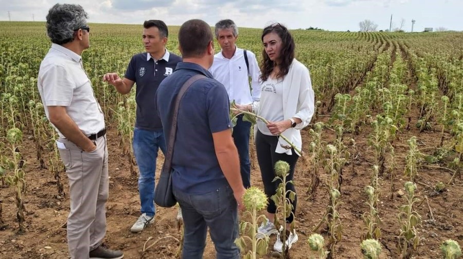 İklim değişikliğinin getirdiği abiyotik stres faktörleri bitkisel üretim üzerinde olumsuz etkileri devam ederken Tekirdağ'da ayçiçeği ekili alanlarında kuraklık nedeni ile oluşan verim kayıplarının tespit edilmesi amacıyla İl ile İlçe Tarım Orman Müdürlüğü teknik personelleri saha çalışmalarına devam ediyor.