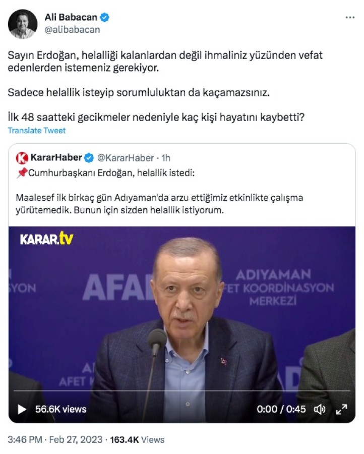 DEVA Partisi Genel Başkanı Ali Babacan, Cumhurbaşkanı ve AKP Genel Başkanı Recep Tayyip Erdoğan'ın, "Maalesef ilk birkaç gün Adıyaman'da arzu ettiğimiz etkinlikte çalışma yürütemedik. Bunun için sizden helallik istiyorum" sözlerine, "Sayın Erdoğan, helalliği kalanlardan değil ihmaliniz yüzünden vefat edenlerden istemeniz gerekiyor. Sadece helallik isteyip sorumluluktan da kaçamazsınız" şeklinde tepki gösterdi.