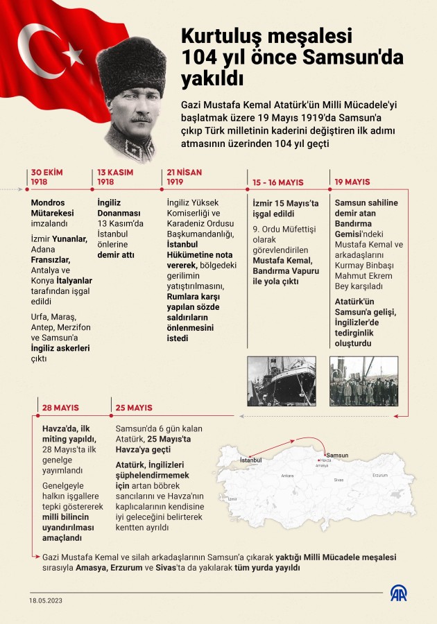 Gazi Mustafa Kemal ve silah arkadaşlarının Samsun'a çıkarak yaktığı Milli Mücadele meşalesi sırasıyla Amasya, Erzurum ve Sivas'ta da yakılarak tüm yurda yayıldı. Milli Mücadele sonunda 29 Ekim 1923'te kurulan Türkiye Cumhuriyeti, bu yıl 100. yaşına giriyor.