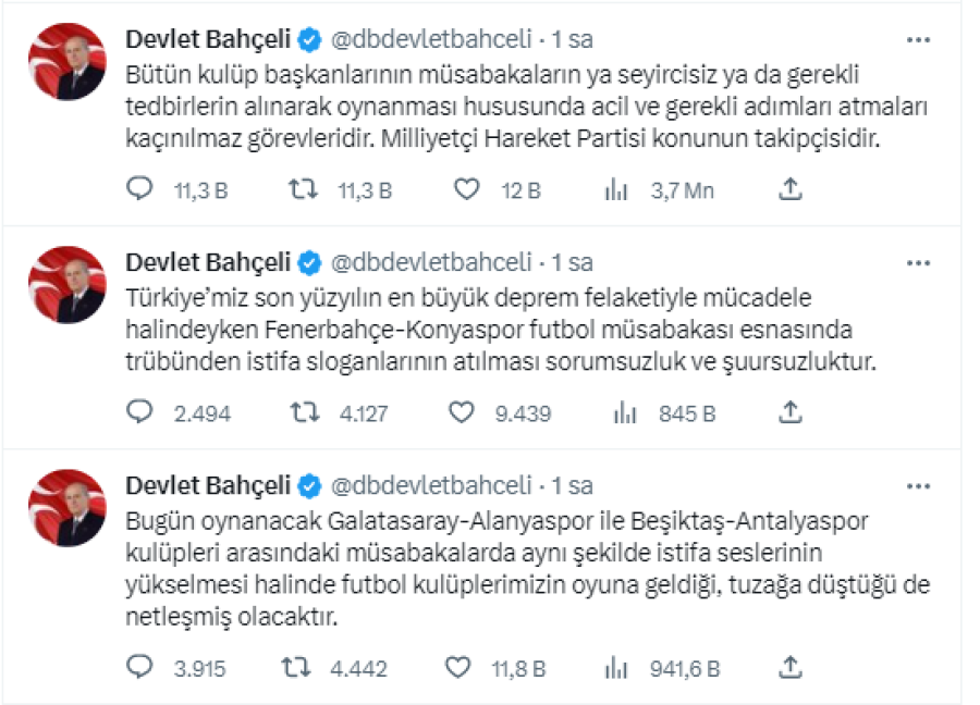 Devlet Bahçeli, dün akşam oynan Fenerbahçe-Konyaspor maçında Fenerbahçe taraftarlarının, Kahramanmaraş merkezli depremlerdeki can kayıpları ve sonrasında yaşananlar nedeniyle hükümeti istifaya çağıran slogan atmasını, 'sorumsuzluk ve şuursuzluk' olarak niteledi. Bahçeli, kulüp başkanlarına, maçların seyircisiz oynanması çağrısında bulundu. Bahçeli'nin sosyal medya hesabından bugün yaptığı açıklama şöyle: