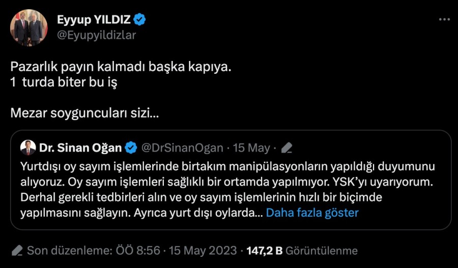 MHP Genel Başkanı Devlet Bahçeli'nin Başdanışmanı Eyyüp Yıldız, sert sözlerle hedef aldığı Ata İttifakı'nın cumhurbaşkanı adayı Sinan Oğan'a, "Pazarlık payın kalmadı başka kapıya. 1 turda biter bu iş Mezar soyguncuları sizi" ifadelerini kullandı.