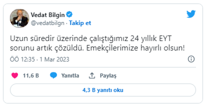 Bilgin, Twitter hesabından yaptığı açıklamada, "Uzun süredir üzerinde çalıştığımız 24 yıllık EYT sorunu artık çözüldü. Emekçilerimize hayırlı olsun!" dedi.