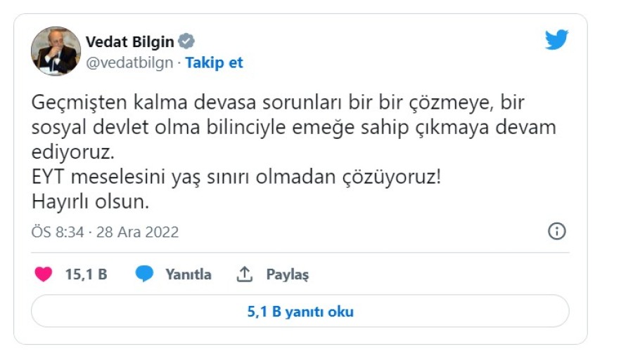 Çalışma ve Sosyal Güvenlik Bakanı Vedat Bilgin "EYT meselesini yaş sınırı olmadan çözüyoruz! Hayırlı olsun." dedi.