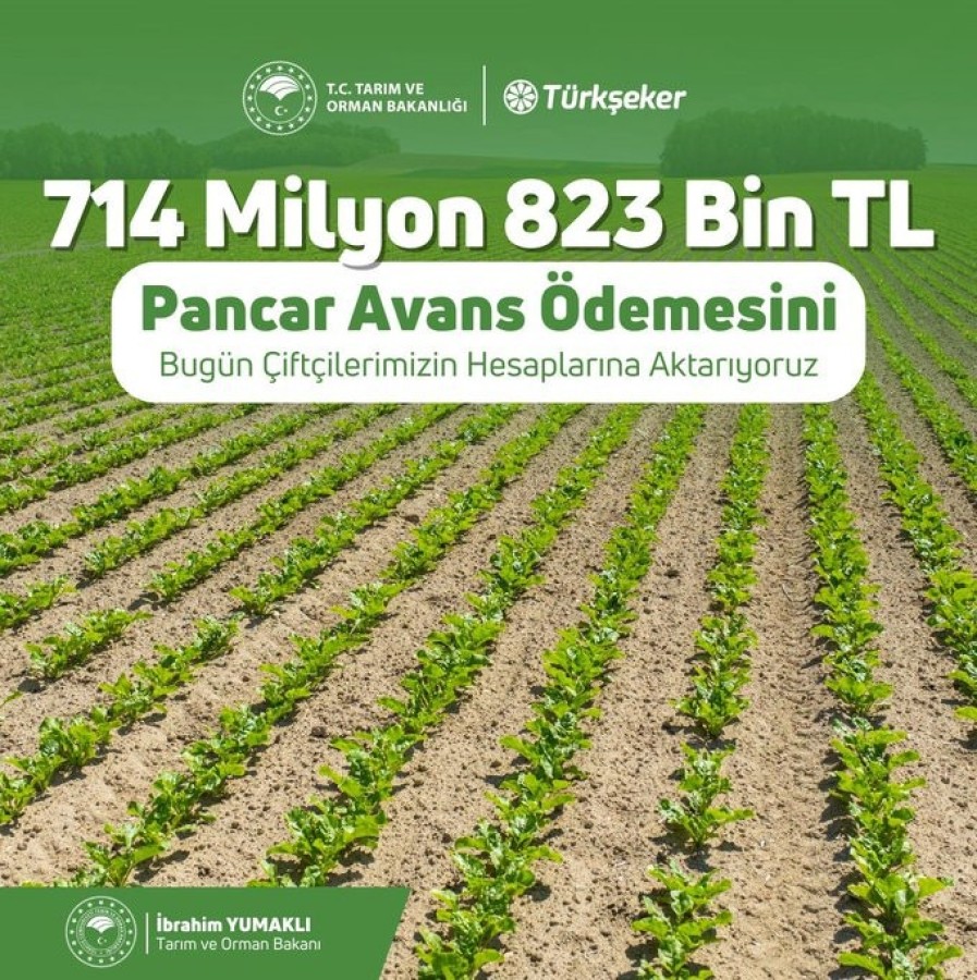 Yumaklı "Türkşeker aracılığıyla 714 milyon 823 bin TL'lik pancar avans ödemesini bugün üreticilerimizin hesaplarına aktarıyoruz. Hayırlı ve bereketli olsun" ifadelerini kullandı.