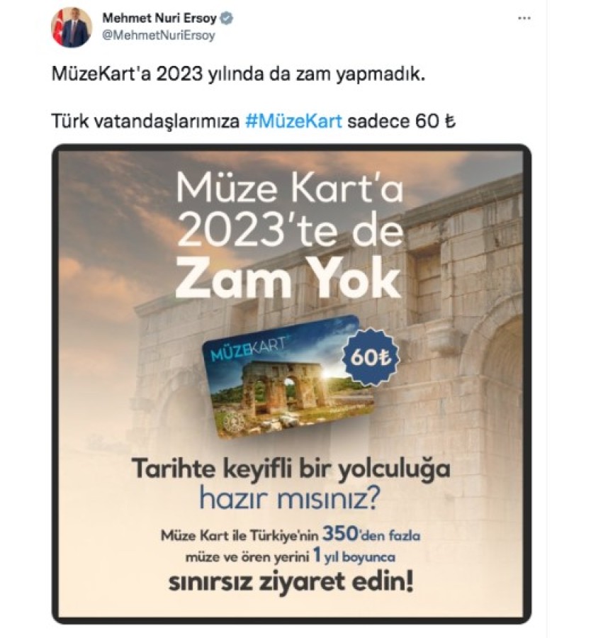 Ersoy, Twitter hesabından yaptığı paylaşımda, "MüzeKart'a 2023 yılında da zam yapmadık. Türk vatandaşlarımıza MüzeKart sadece 60 lira" açıklamasında bulundu.