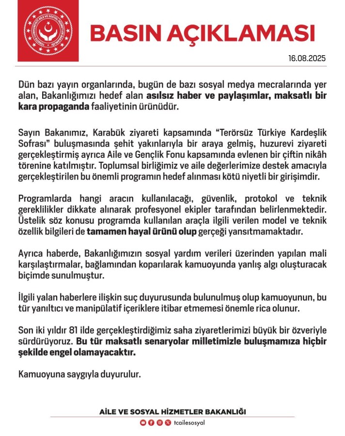 Aile ve Sosyal Hizmetler Bakanlığı'nca, makam aracıyla ilgili iddiaların yer aldığı haberlerin gerçeği yansıtmadığı ifade edilerek, suç duyurusunda bulunulduğu bildirildi. Açıklamada, "Programlarda hangi aracın kullanılacağı, güvenlik, protokol ve teknik gereklilikler dikkate alınarak profesyonel ekipler tarafından belirlenmektedir. Üstelik söz konusu programda kullanılan araçla ilgili verilen model ve teknik özellik bilgileri de tamamen hayal ürünü olup gerçeği yansıtmamaktadır" ifadelerine yer verildi.