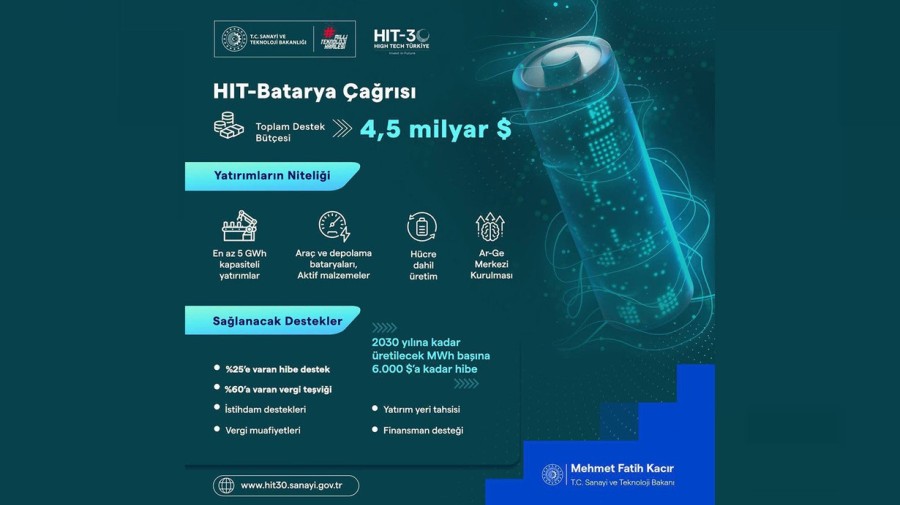 HİT-30 programının birçok bileşeni olduğunu da kaydeden Kacır, "Hedefimiz, 4,5 milyar dolara varan desteklerle 80 gigawatt saat batarya üretim kapasitesini Türkiye'de oluşturmak. Elektrikli araçlar ve enerji depolama sektörlerinde kritik ihtiyaç olan bataryaların Türkiye'de geliştirilmesi ve üretimi için 2030'a kadar megawatt saat başına 6 bin dolara kadar hibe destekleri de içeren teşvikler sunacağız. Türkiye, yüksek teknoloji üretim üssü olacak" dedi.