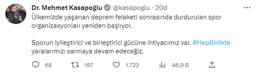 "Ülkemizde yaşanan deprem felaketi sonrasında durdurulan spor organizasyonları yeniden başlıyor. Sporun iyileştirici ve birleştirici gücüne ihtiyacımız var. #HepBirlikte yaralarımızı sarmaya devam edeceğiz."