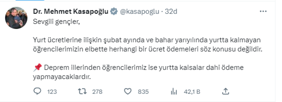 Twitter'dan açıklama yapan Kasapoğlu, "Sevgili gençler, Yurt ücretlerine ilişkin şubat ayında ve bahar yarıyılında yurtta kalmayan öğrencilerimizin elbette herhangi bir ücret ödemeleri söz konusu değildir.