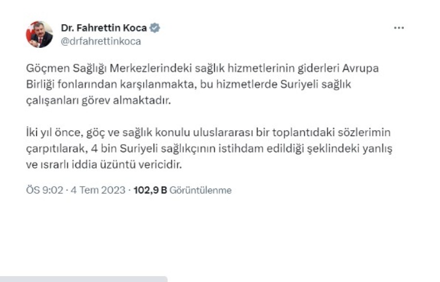"Göçmen Sağlığı Merkezlerindeki sağlık hizmetlerinin giderleri Avrupa Birliği fonlarından karşılanmakta, bu hizmetlerde Suriyeli sağlık çalışanları görev almaktadır. İki yıl önce, göç ve sağlık konulu uluslararası bir toplantıdaki sözlerimin çarpıtılarak, 4 bin Suriyeli sağlıkçının istihdam edildiği şeklindeki yanlış ve ısrarlı iddia üzüntü vericidir."