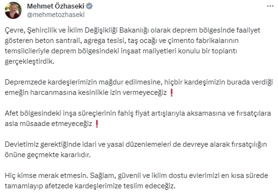 Bakan Özhaseki, sosyal medya hesabından yaptığı açıklamada, "Çevre, Şehircilik ve İklim Değişikliği Bakanlığı olarak deprem bölgesinde faaliyet gösteren beton santrali, agrega tesisi, taş ocağı ve çimento fabrikalarının temsilcileriyle deprem bölgesindeki inşaat maliyetleri konulu bir toplantı gerçekleştirdik. Depremzede kardeşlerimizin mağdur edilmesine, hiçbir kardeşimizin burada verdiği emeğin harcanmasına kesinlikle izin vermeyeceğiz. Afet bölgesindeki inşa süreçlerinin fahiş fiyat artışlarıyla aksamasına ve fırsatçılara asla müsaade etmeyeceğiz. Devletimiz gerektiğinde idari ve yasal düzenlemeleri de devreye alarak fırsatçılığın önüne geçmekte kararlıdır. Hiç kimse merak etmesin. Sağlam, güvenli ve iklim dostu evlerimizi en kısa sürede tamamlayıp afetzede kardeşlerimize teslim edeceğiz" dedi.