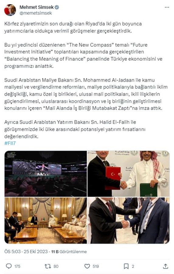Şimşek, "Bu yıl 7'ncisi düzenlenen 'The New Compass' temalı 'Future Investment Initiative' toplantıları kapsamında gerçekleştirilen 'Balancing the Meaning of Finance' panelinde Türkiye ekonomisini ve programımızı anlattık. Suudi Arabistan Maliye Bakanı Sayın Mohammed Al-Jadaan ile kamu maliyesi ve vergilendirme reformları, maliye politikalarıyla bağlantılı iklim değişikliği, kamu özel iş birlikleri, ulusal mali politikaları, ikili ilişkilerin güçlendirilmesi, uluslararası koordinasyon ve iş birliğinin geliştirilmesi konularını içeren 'Mali Alanda İş Birliği Mutabakat Zaptı'na imza attık. Ayrıca Suudi Arabistan Yatırım Bakanı Sayın Halid El-Falih ile görüşmemizde iki ülke arasındaki potansiyel yatırım fırsatlarını değerlendirdik" ifadelerini kullandı.