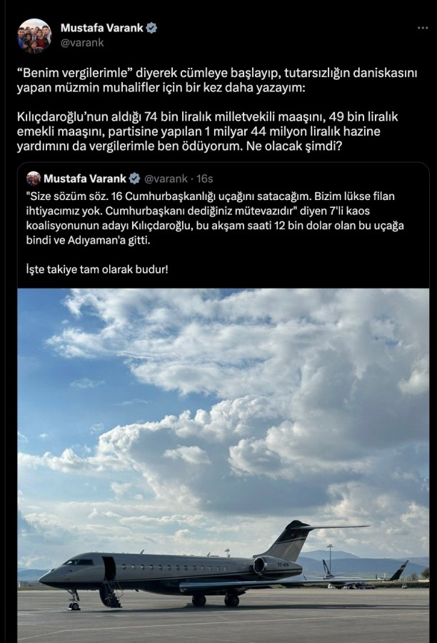 Sanayi ve Teknoloji Bakanı Mustafa Varank Twitter'dan bir uçağın fotoğrafını paylaştı ve "Size sözüm söz. 16 Cumhurbaşkanlığı uçağını satacağım. Bizim lükse filan ihtiyacımız yok. Cumhurbaşkanı dediğiniz mütevazıdır" diyen 7'li kaos koalisyonunun adayı Kılıçdaroğlu, bu akşam saati 12 bin dolar olan bu uçağa bindi ve Adıyaman'a gitti. İşte takiye tam olarak budur!" ifadelerini kullandı.