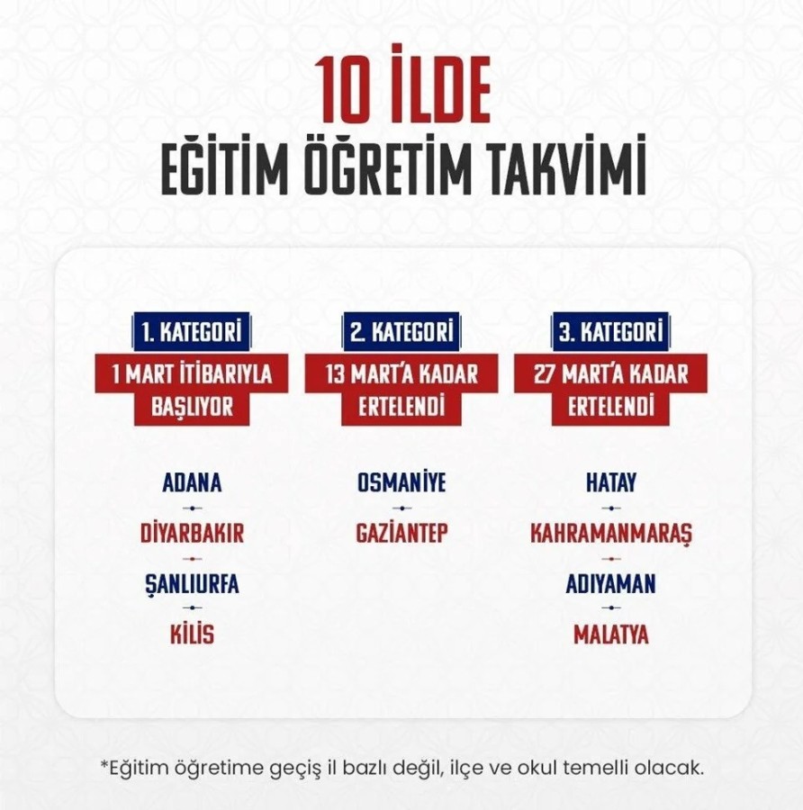 Adana, Kilis, Diyarbakır ve Şanlıurfa'da merkez ve tüm ilçelerde 1 Mart itibarıyla eğitim ve öğretime başlıyoruz.