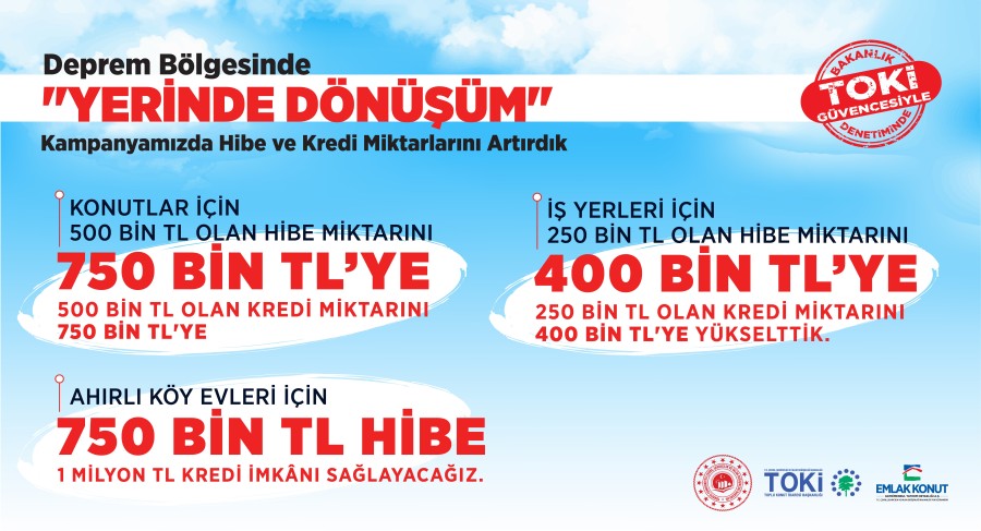 Çevre, Şehircilik ve İklim Değişikliği Bakanı Mehmet Özhaseki, "Yerinde Dönüşüm kampanyamızda hibe ve kredi miktarlarını artırdık. Konutlar için 750 bin TL hibe, 750 bin TL kredi, ahırlı köy evleri için 750 bin TL hibe, 1 milyon TL kredi, iş yerleri için 400 bin TL hibe, 400 bin TL kredi vereceğiz. Deprem bölgesinde ev ve iş yerlerini yerinde dönüştürmek isteyen vatandaşlarımıza hayırlı olsun" söyleminde bulundu.