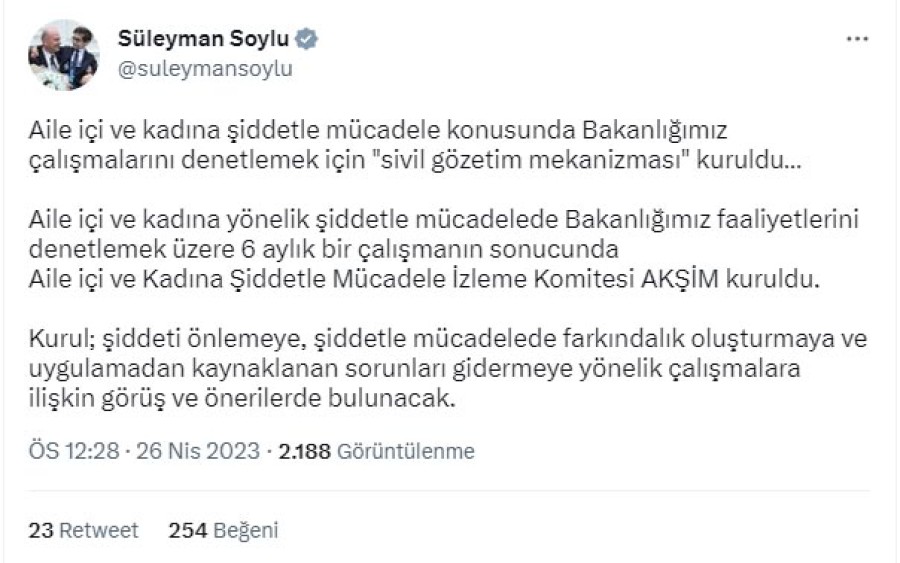 Bakan Soylu, Twitter hesabından yaptığı açıklamada, "Aile içi ve kadına yönelik şiddetle mücadelede bakanlığımız faaliyetlerini denetlemek üzere 6 aylık bir çalışmanın sonucunda 'Aile İçi ve Kadına Şiddetle Mücadele İzleme Merkezi' (AKŞİM) kuruldu. Kurul; şiddeti önlemeye, şiddetle mücadelede farkındalık oluşturmaya ve uygulamadan kaynaklanan sorunları gidermeye yönelik çalışmalara ilişkin görüş ve önerilerde bulunacak" ifadelerini kullandı.